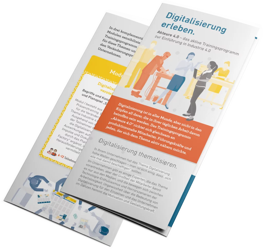 In drei komplementären Modulen sensibilisiert das Trainingsprogramm Akteure 4.0 für Herausforderungen und Fragestellungen der Digitalisierung und stimuliert partizipative Veränderungsprozesse im Unternehmen. Eingebettet in Modul I ist das Planspiel „Smart Factory“, das die Anwesenden aktive Entscheidungen zu Digitalisierung treffen lässt und begleitet wird von Begriffseinführungen zu Digitalisierung und dem Start eines Ideenentwicklungsprozess für Ihr Unternehmen.
